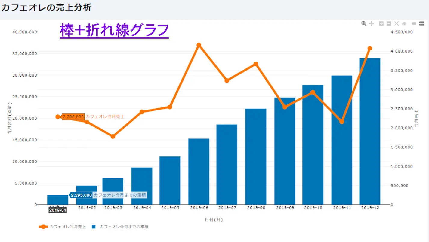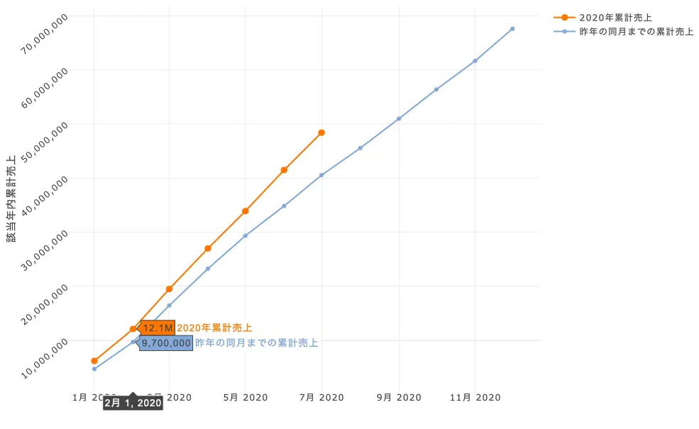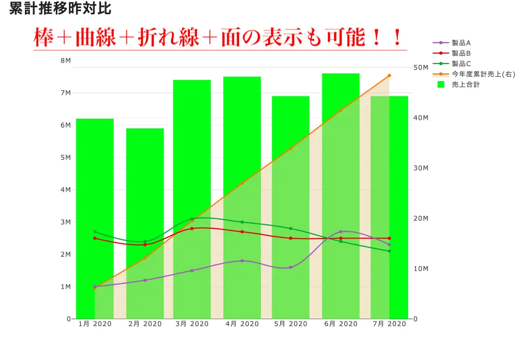 また、今年と昨年の「累計売上」を『折れ線グラフ』で同時に表示させた「累積グラフ」のように、Y軸の単位を「累計売上」のひとつにまとめることも可能です。同一の単位のグラフを2つ同時に表示させることで、昨年からの伸び方も簡単に可視化できます。