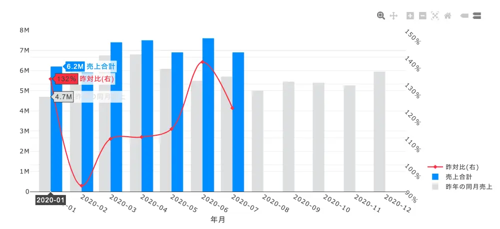 こちらは、売上高を『縦棒グラフ』、昨年対比を『曲線グラフ』で表した2軸の「前年比グラフ」です。「期間(月)」がX軸、「売上高(円)」と「昨年対比(%)」がY軸で表示されています。