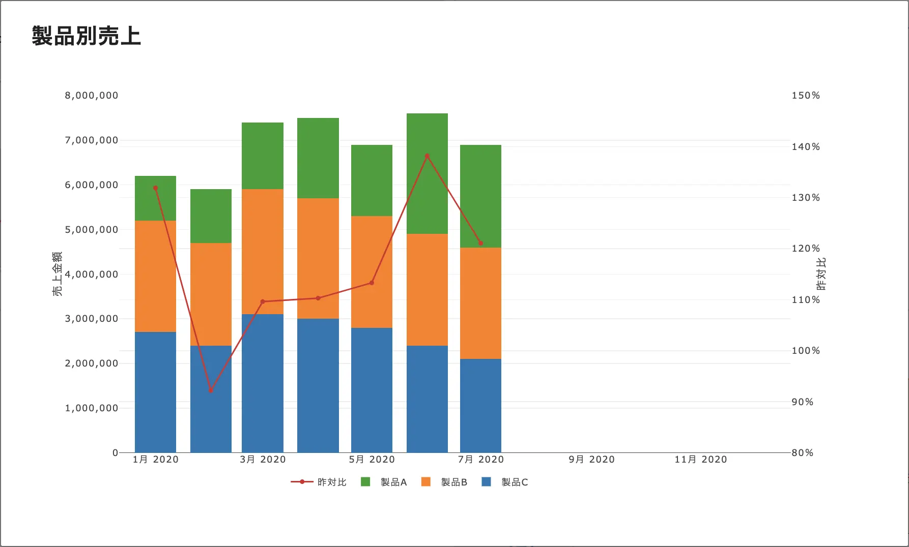 1年前の同時期と比較して良くなっているのか、どの製品が伸びているのかを1つのグラフにまとめることで、視認性の高い資料を作成できます。