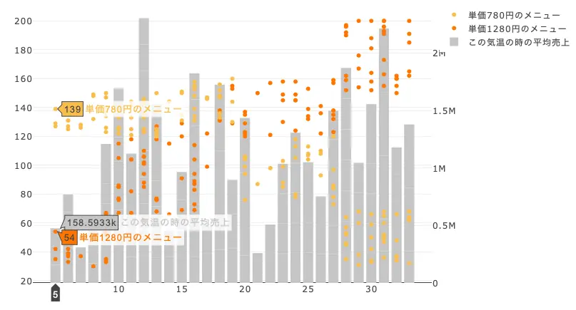 『散布図』と『棒グラフ』を組み合わせて、異なる単価商品の売上個数とその気温の時の平均売上を一画面でわかるように「相関図」としてグラフ化することも可能です。これを分析することで総売上のデータだけでは気づけなかった、「気温」と「売れるメニュー」の相関性を発見できます。