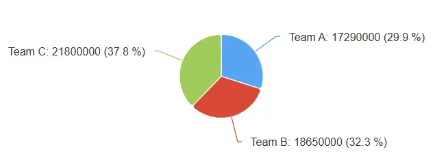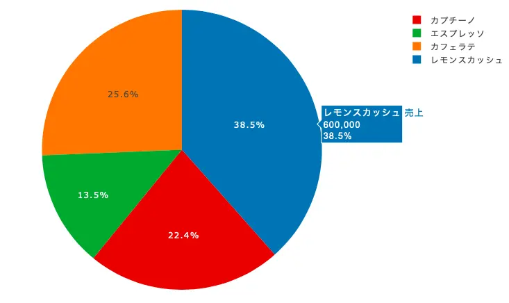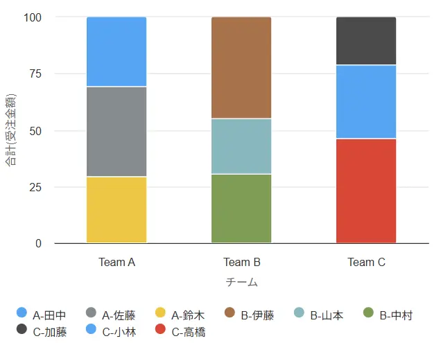 上記の例では、売上全体の中の、チームごとの割合を表現するのに使用しています。