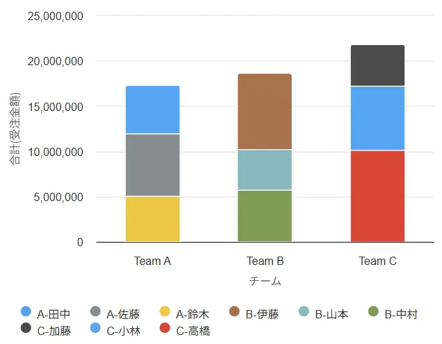 上記に載せたように、「チームごとの売上の比較」のような、数値を比較するのに適したグラフです。