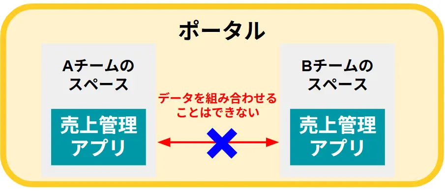 たとえば、kintoneの基本機能では「アプリをまたいだ集計」はできません。以下のように、チームごとに売上管理アプリを作っていた場合、各チームの売上をkintone上で組み合わせて使うことはできません。