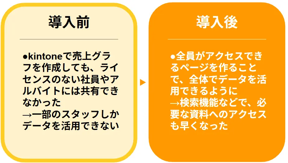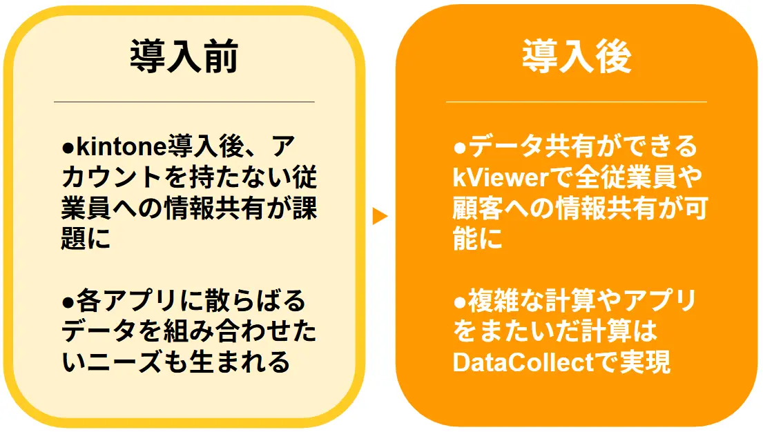 スモールスタートでkintoneの活用をされる中で、「アカウントがない従業員への共有」や「データを使ったより複雑な計算」などのニーズが発生していきました。