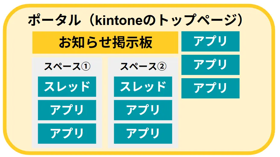 ポータル | kintoneにログインしたら全員に表示される、メインの場所。各スペースなどにつながるロビーのような位置。