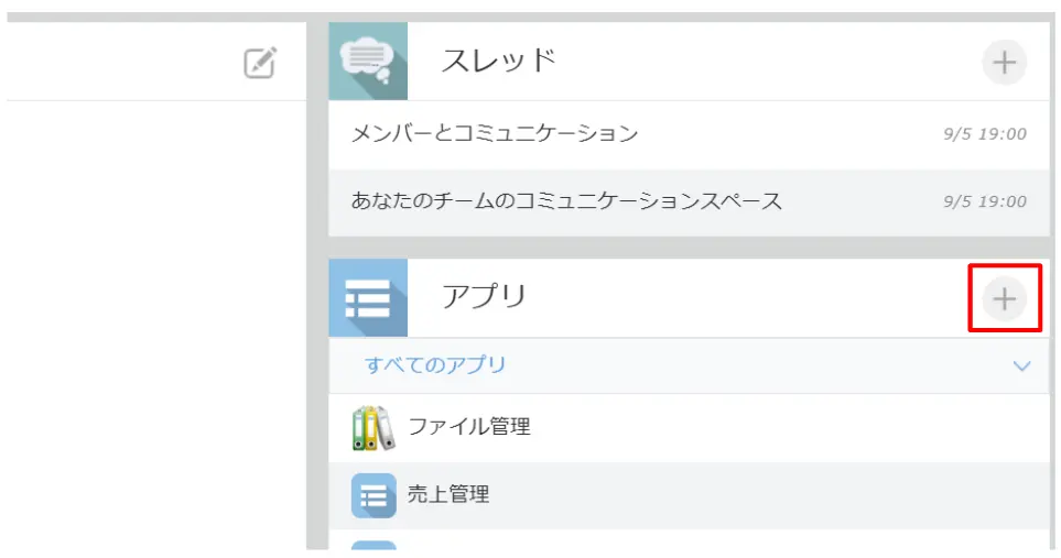 まずはスペースのトップメニューの右側にある、アプリの横の「+」マークをクリックしてください。