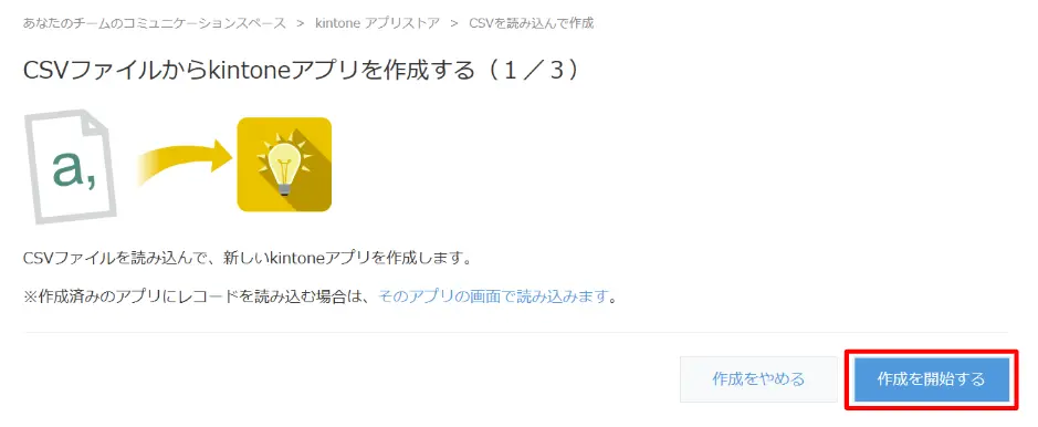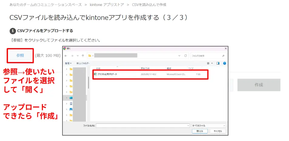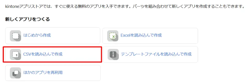 元データなしでアプリを作るときは「初めから作成」を選びますが、今回はCSVデータを使うため、「CSVを読み込んで作成」を選択します。