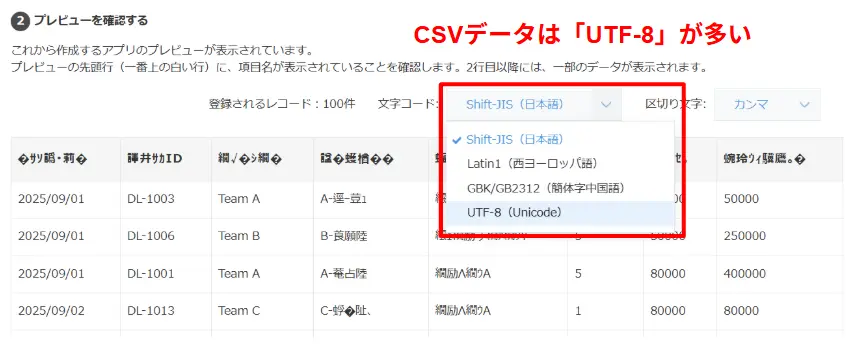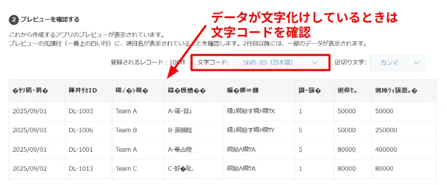 また、ファイルのアップロード後にデータが文字化けしていることがありますが、このときは「文字コード」を変更してみてください。