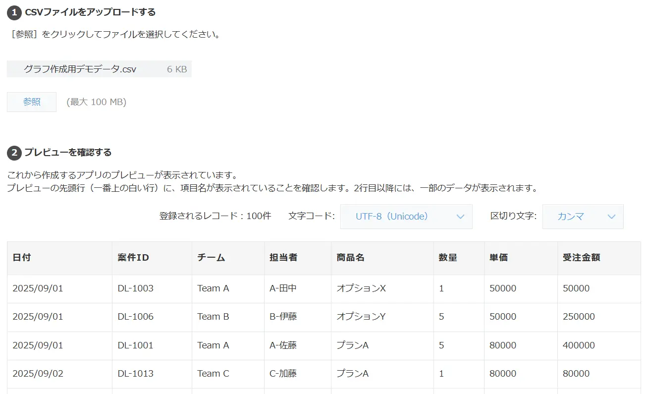 ここでは、「CSV形式のデータを使ってアプリ・グラフを作成する」方法を、練習用のデモデータを使いながら解説していきます。