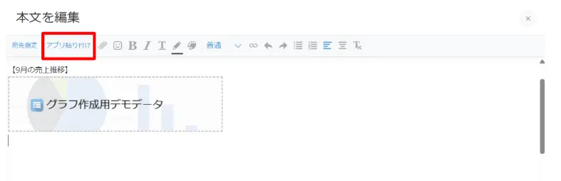 グラフを載せるには、「本文を編集」内の「アプリ貼り付け」から、共有したいアプリとグラフを選択します。