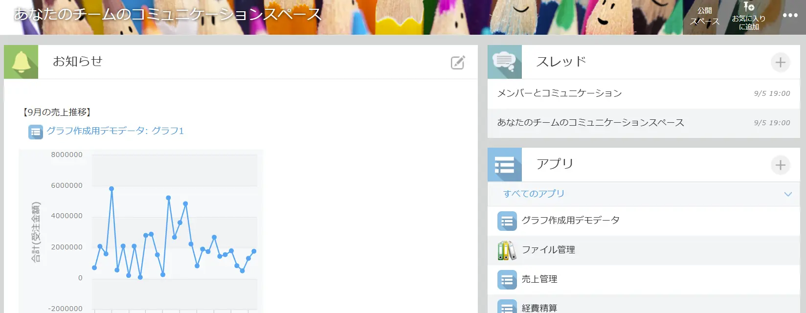 ・作成したグラフをkintoneの「スペース」や「お知らせ掲示板」に表示させる ・定期レポートを作成する |