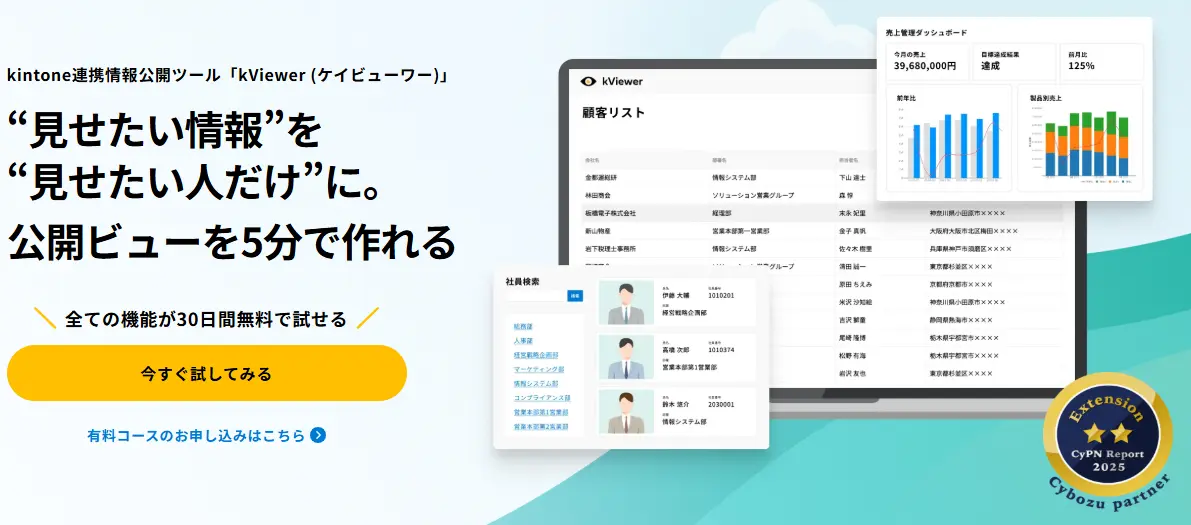 続いて紹介するのは、kintoneのアクセス権がないユーザーにもデータを共有できるkViewerです。