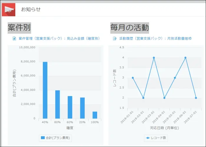 案件状況をダッシュボードに表示することで、営業担当者やマネージャーが全体の進行度を常に把握でき、フォローの必要性や改善点も早期に発見できます。また、営業戦略の立案やリソース配分の判断にも役立ちます。