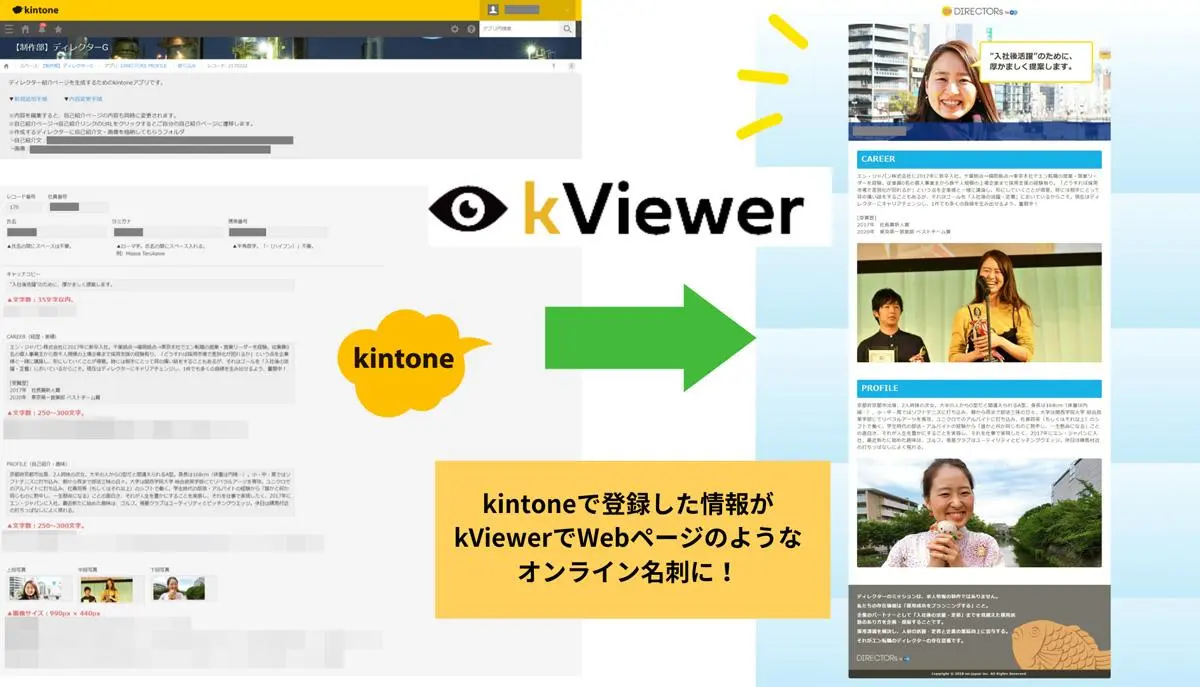 kintone内の情報を外部に公開できる「kViewer」と連携させると、プロフィールページのデータが反映されます。