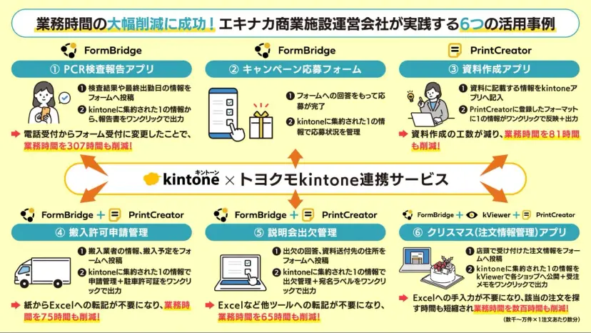 >事例記事:理想のツールを簡単に内製化!業務時間を75時間削減した、エキナカ商業施設運営会社のトヨクモkintone連携サービス活用事例