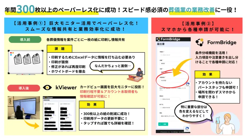 >事例記事:kViewerで300枚以上の印刷紙削減に成功!迅速かつ多様な葬儀業界の業務改善と相性の良いトヨクモのkintone連携サービス事例
