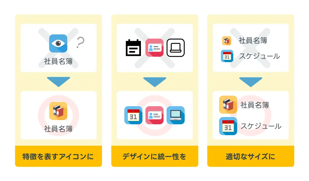 とくに業務フローの重要なアプリや頻繁に使用するアプリでは、誰でもひと目で判別できるデザインを選びましょう。