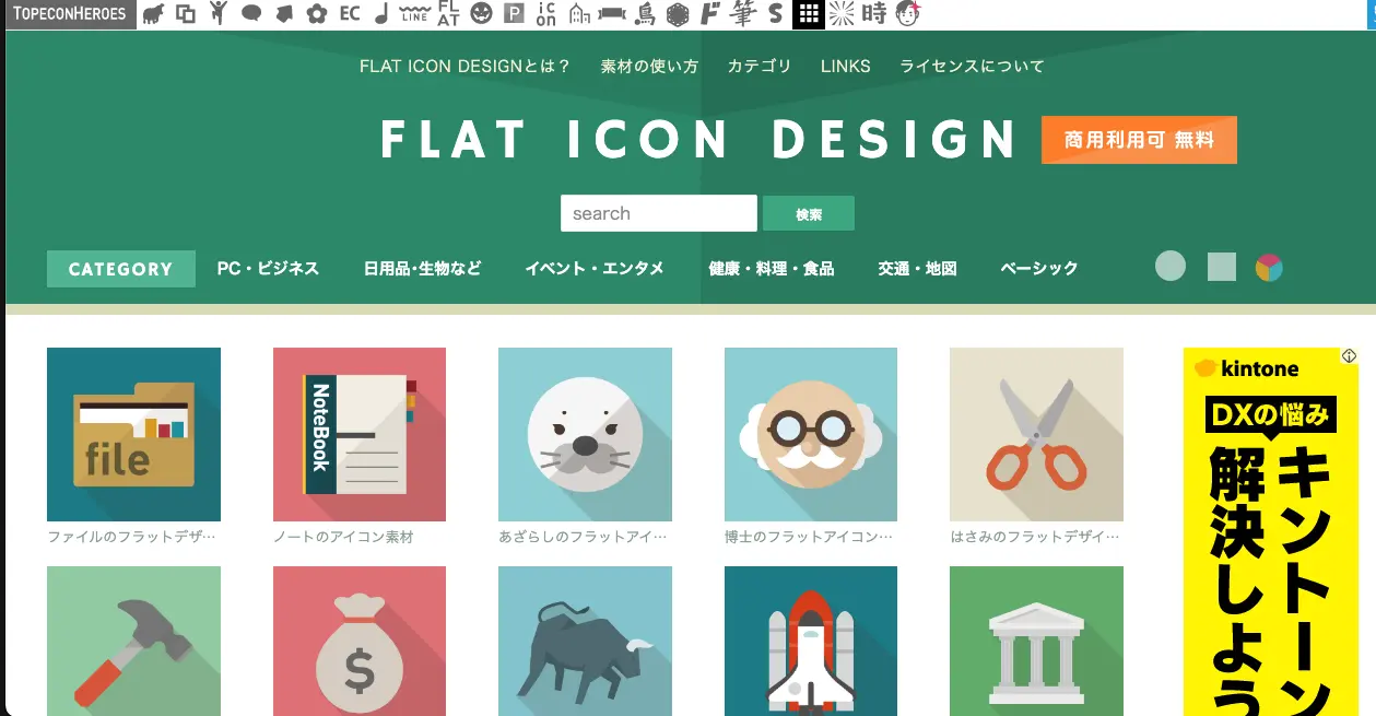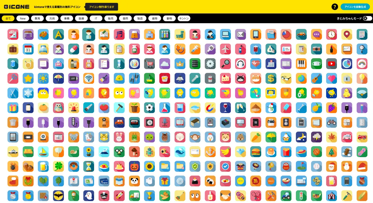 kintone専用のアイコンダウンロードサイトではありませんが、余計な装飾を省いたフラットなデザインのアイコンは、どのようなシーンでも活用できる汎用性の高いものとなっています。kintoneの業務効率化を図りたい場合にもピッタリです。