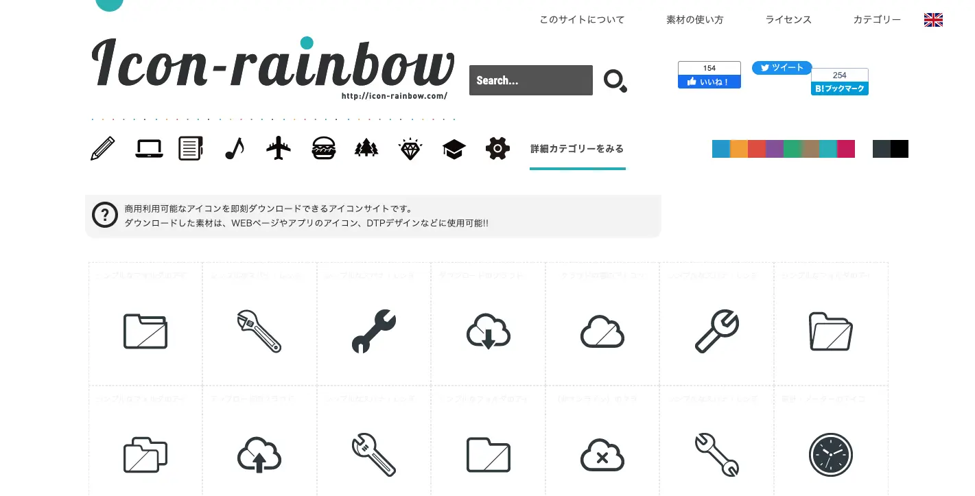 Icon-rainbowは、kintoneだけでなく、WebデザインやDPT制作、スマートフォンのメニューアイコンまで幅広い素材を提供しているサイトです。