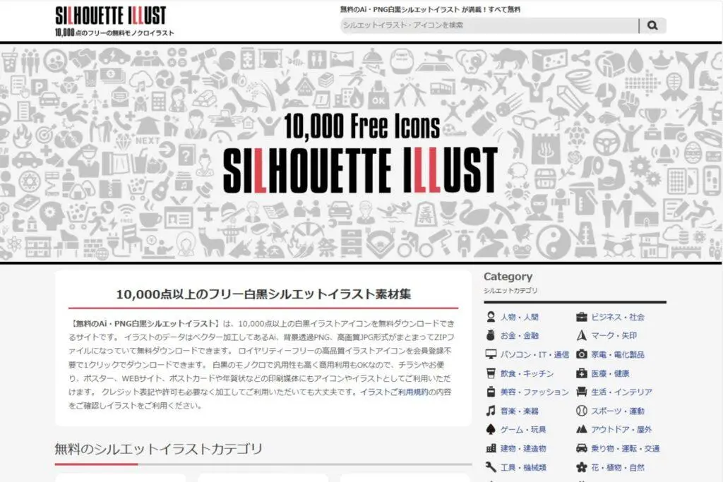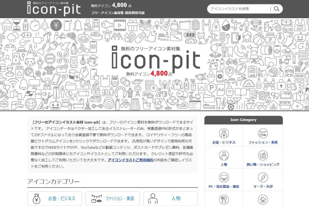 サイト内では膨大な数のアイコン素材が提供されていますが、カテゴリー別に検索ができるので、お目当てのアイコンがすぐに見つかるでしょう。また、使いやすいJPGやPNG画像に加え、AiデータやEPSデータ、SVG画像まで対応しています。