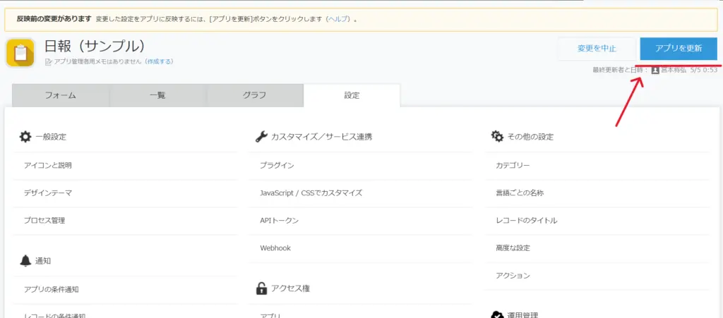 「アプリを更新」をクリックすれば設定は完了です。