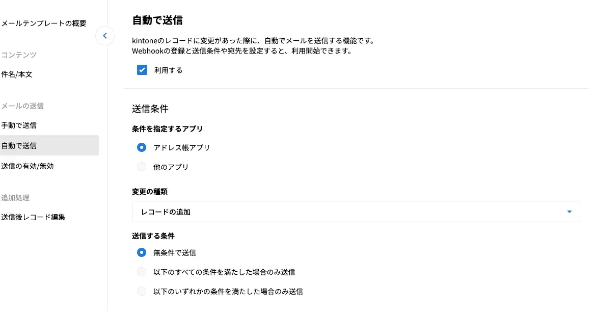 kMailerではkintone内のデータに連動して、自動でメールを送信する機能があります。