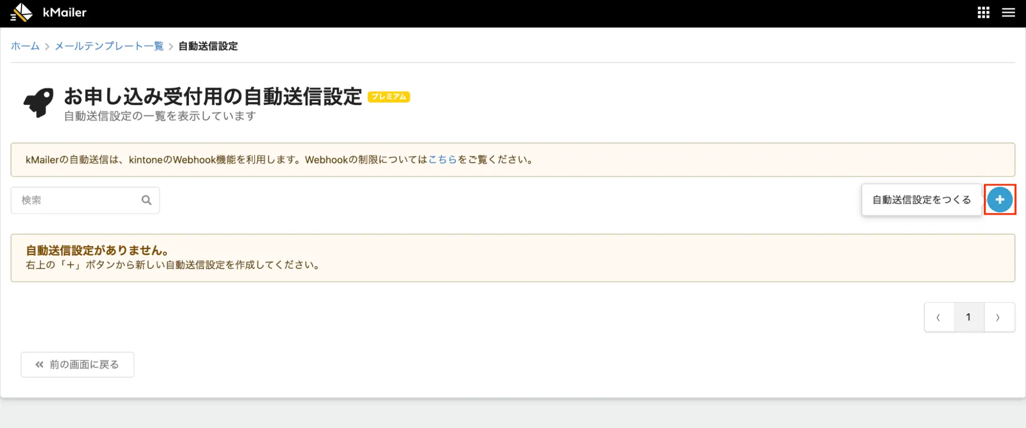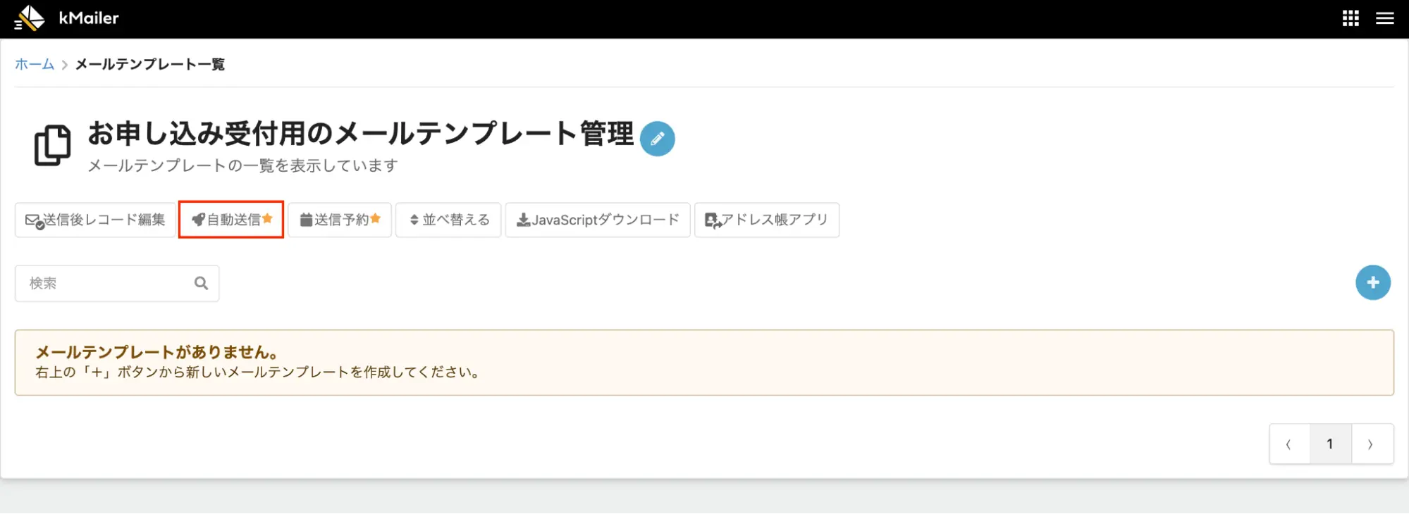 kMailerのメールテンプレート一覧画面の「自動送信」をクリックします。