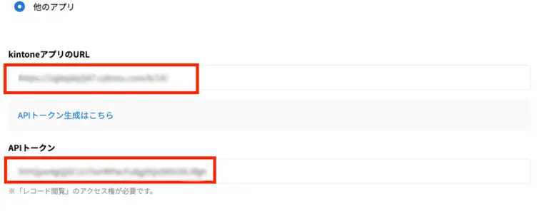例えば、申し込み受付アプリのレコード更新に合わせてメールを送信したい場合、申し込み受付アプリのURLとAPIトークンを入力します。次の画面に進みます。