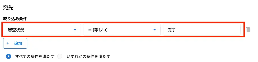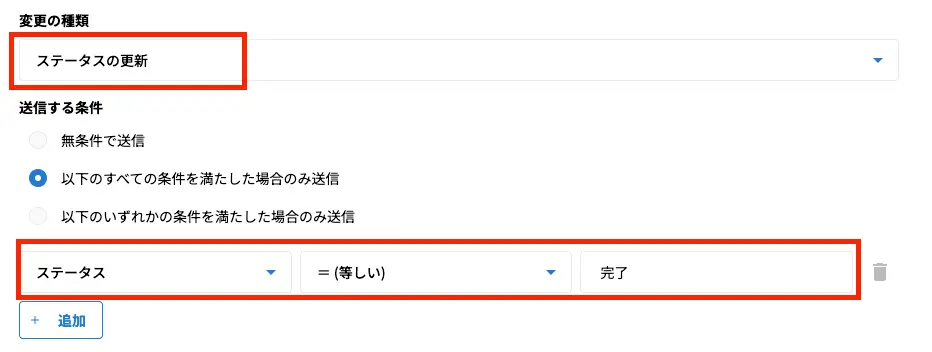 ここではレコードのステータスが「完了」となったときに、メールが自動で送信されるように設定します。