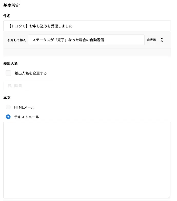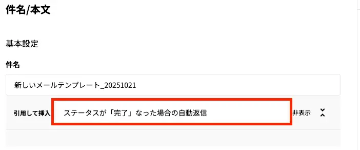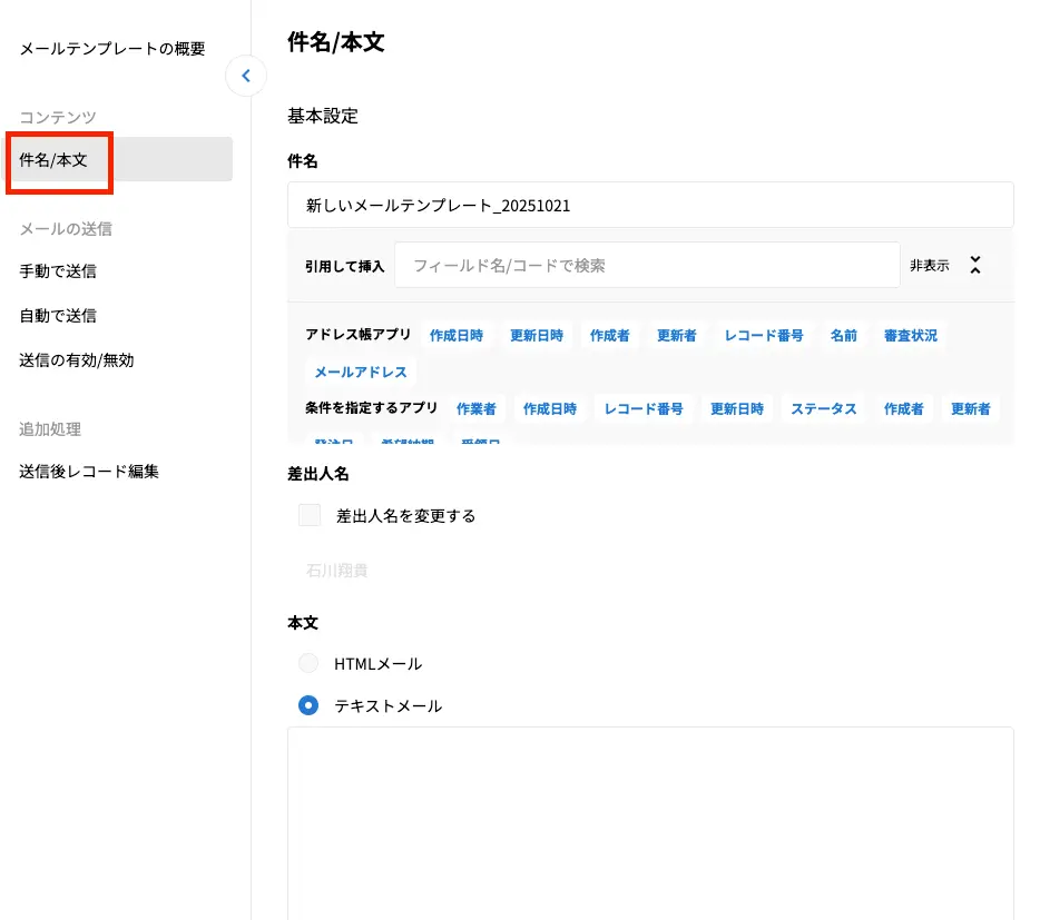 メールテンプレート名と件名、本文を入力します。アドレス帳アプリや条件を指定するアプリから、レコードのフィールドを引用できます。