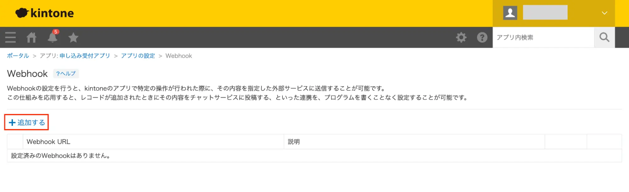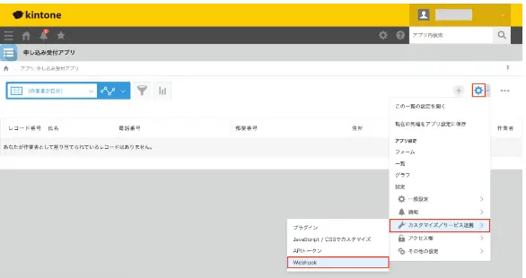 kintoneアプリ上で、設定→カスタマイズ/サービス連携→Webhookに進みます。