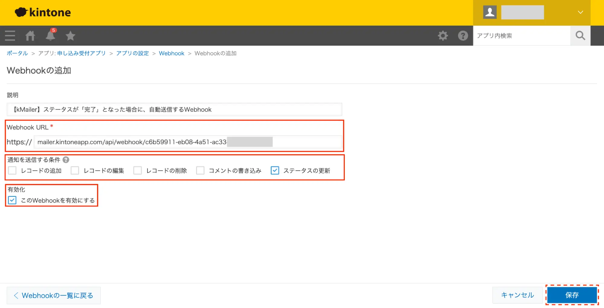 「このWebhookを有効にする」にチェックを入れてから「保存」します。