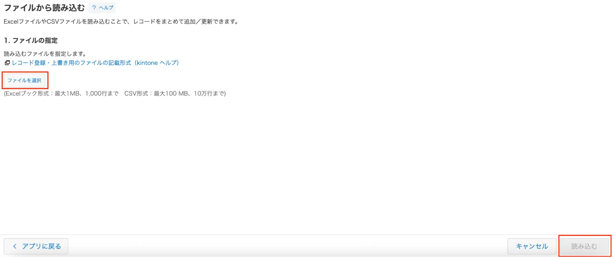 そのため、一覧画面で直接レコードを編集するような直感的な操作でまとめて更新したい、といった場合は、基本機能だけでは対応できない点に注意が必要です。毎回ファイル読み込みの画面に遷移する必要があるため、操作の手間が増え、特に頻繁に更新を行う場合には、その都度発生する手間が使いにくさにつながります。