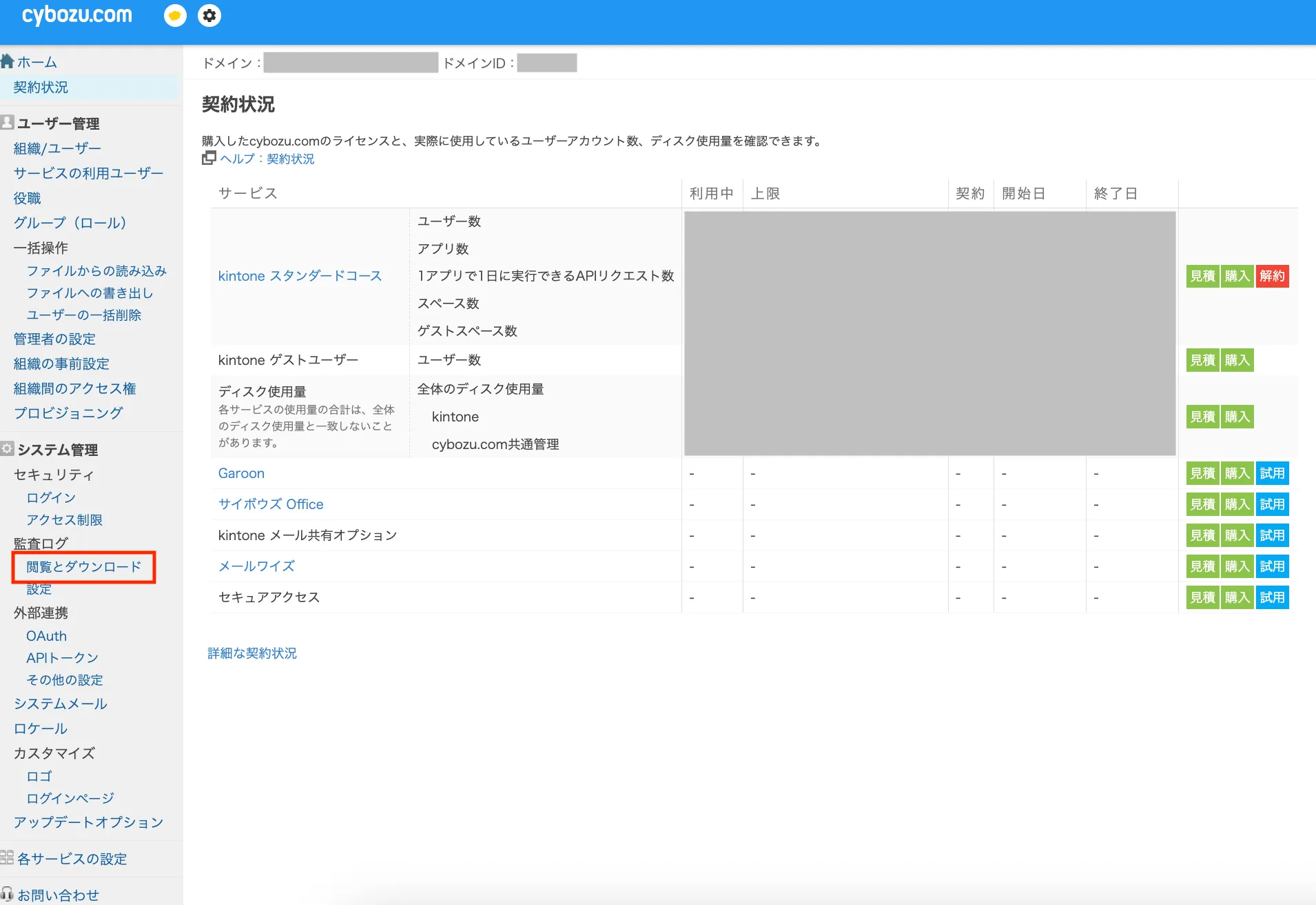 「cybozu.com共通管理画面」が開いたら「閲覧とダウンロード」をクリックします。すると、監査ログの画面がひらきます。
