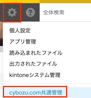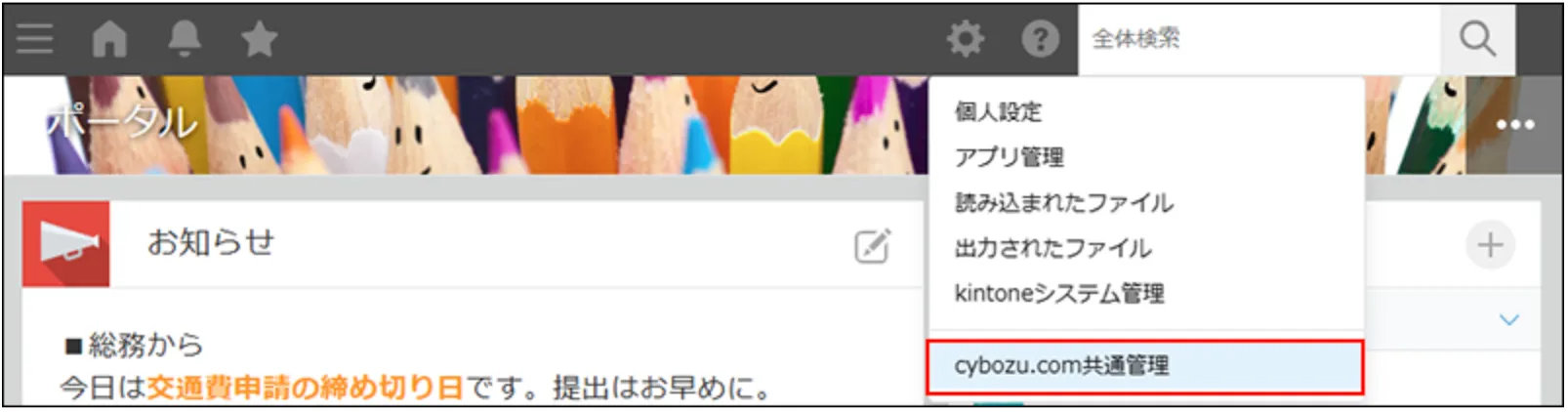 kintoneポータルの「設定」をクリックし、「cybozu.com共通管理」を選択 |