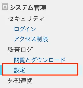 cybozu.com共通管理画面の左側にある設定メニューから、監査ログ配下にある「設定」をクリック |