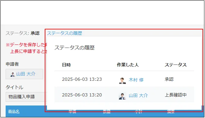 プロセス管理の申請や承認の履歴 [表示される操作例]
