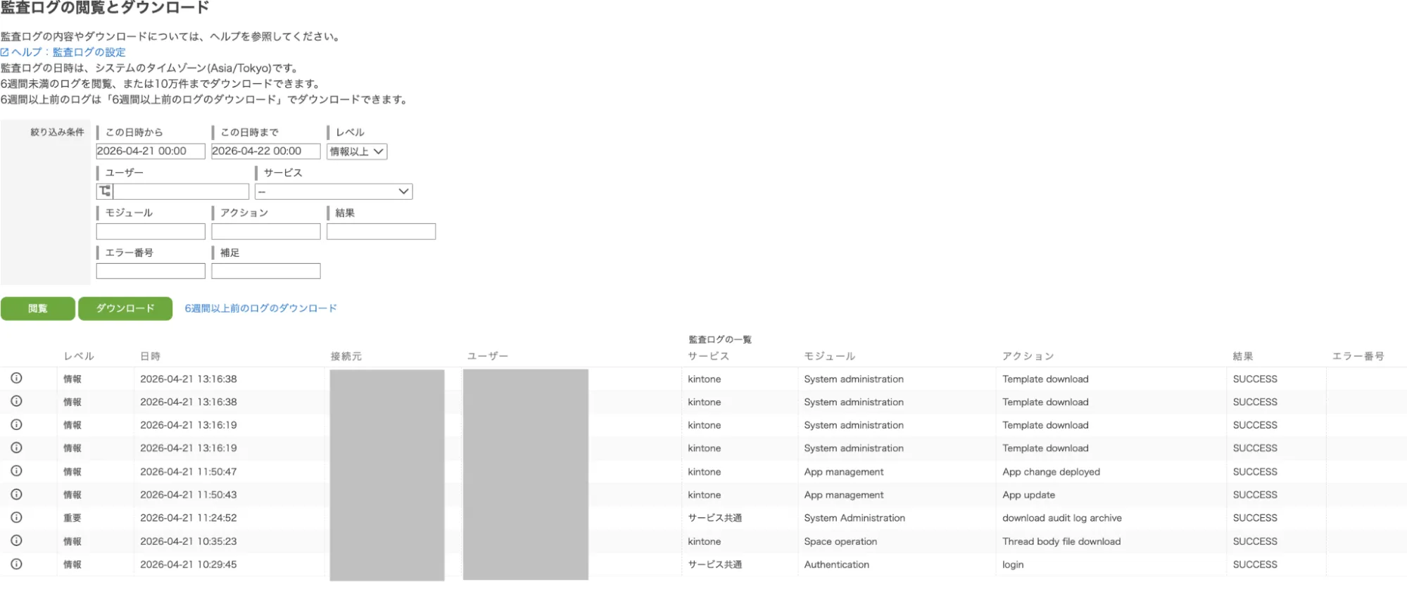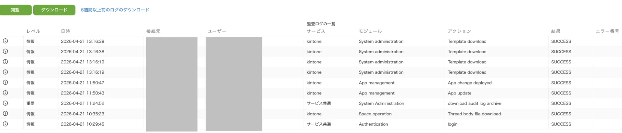![]() ▲出典:kintone公式サイト「kintone ヘルプ|kintoneの監査ログの確認方法」 |