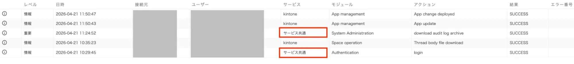 cybozu.com共通管理画面で行う操作は、おもにログインやユーザーの設定など、サイボウズのサービス全体にかかわる設定が監査ログに出力されます。その際は、監査ログの「サービス」の項目に「サービス共通」と表示されます。