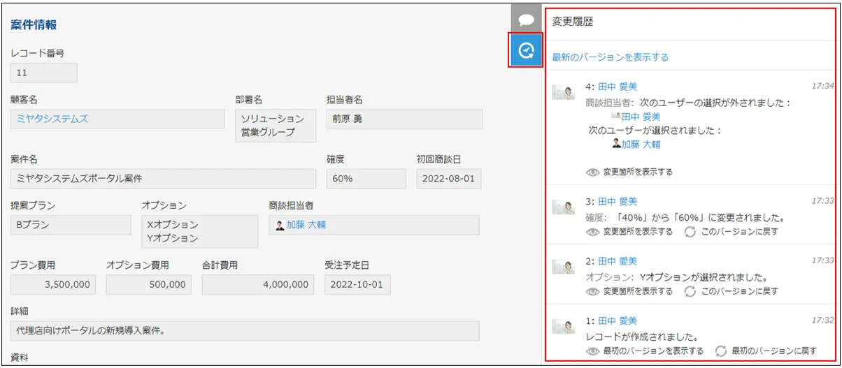 また、レコードの変更履歴を活用することで、「どのフィールドが何の値に書き換えられたか」を追跡することも可能です。