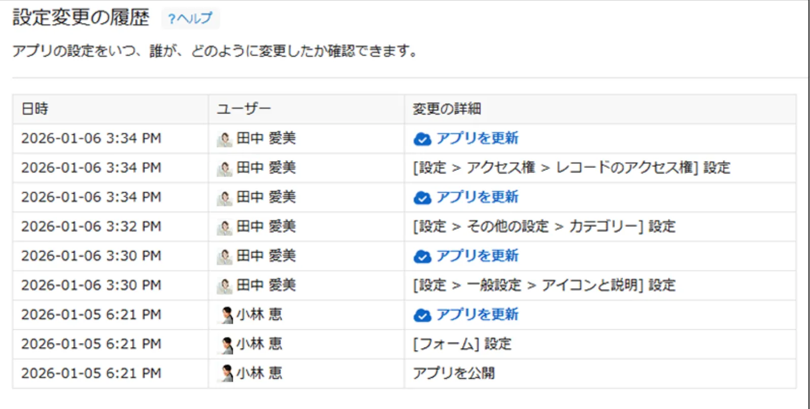 ![]() ▲出典:kintone公式サイト「kintone ヘルプ|アプリの設定変更の履歴を確認する」 |