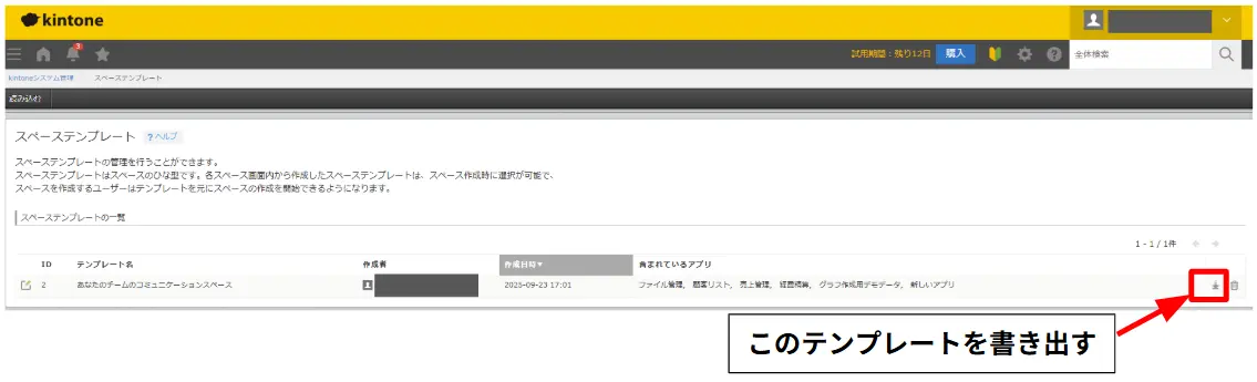 スペースのテンプレートをダウンロードするには、テンプレートを保存している必要があるため、まずは kintone内に保存するの手順に沿ってテンプレートを作ってください。