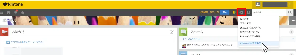 まずは、右上のメニューから「kintoneシステム管理」を開いてください。
