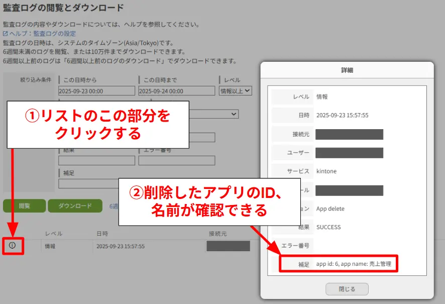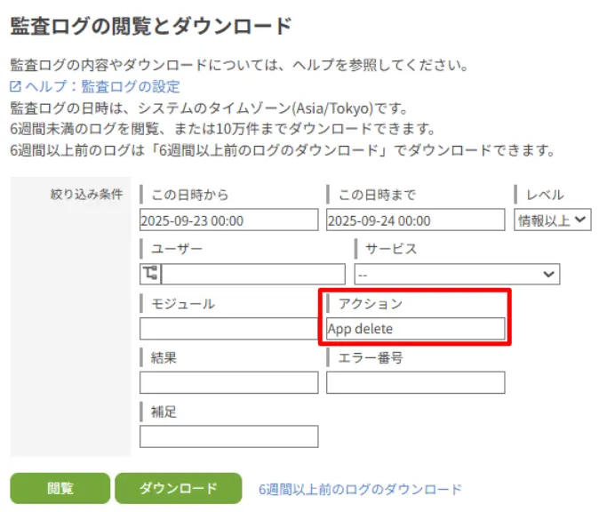また、削除されたアプリやスペースが多い場合には、削除された日時やユーザーを絞り込み条件に入れることで結果を絞ることができます。