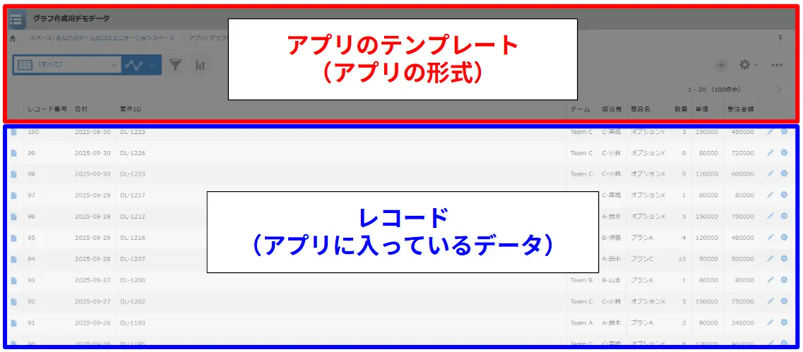 テンプレートから復元したアプリは、以下の「レコード」の部分が空になっています。