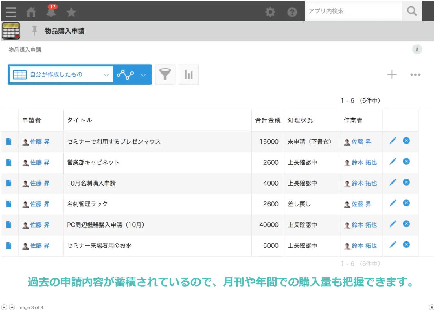 申請業務をkintoneに集約することも可能です。kintoneでワークフローを回すことで、提出や押印の手間をなくし、外出時に承認が止まることも防げます。