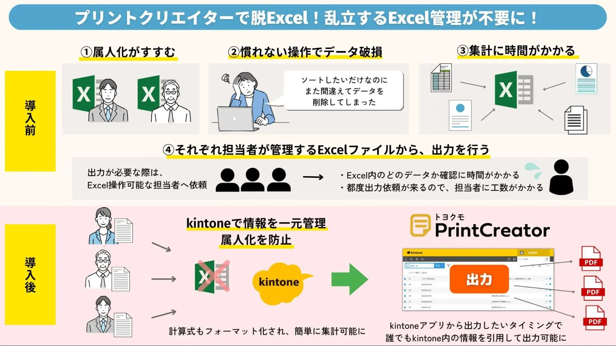 そこで、kintoneとトヨクモが提供するkintone連携サービス「PrintCreator」「kBackup」を導入し、脱Excelを実現しました。