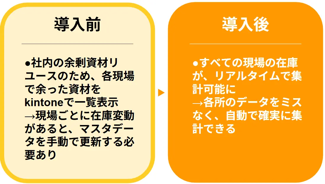 そこでDataCollectを活用し、各資材の在庫がリアルタイムで更新されるようにしました。 その結果、リアルタイムな情報が常に確認できるようになり、現場でのアプリ活用が推進。その他の連携サービスと組み合わせた活用の結果、年間400kgものプラスチックの削減に成功し、新たな資材購入の経費も、月間47万円削減が実現しました。 事例の詳細はこちら「建設業の多数業務をkintoneでDX化!残業時間/紙/廃棄物の削減・新卒定着率向上の成果を生んだ活用事例」 |