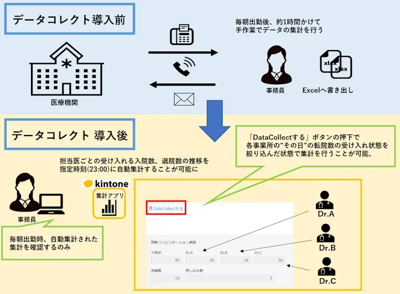 ![]() 京都リハビリテーション病院様では、複数アプリに散在する患者情報を手作業で集計するため、毎日1時間もの作業が発生していました。 そこで、DataCollectを導入し、この集計作業を完全に自動化しました。 作業時間がゼロになり、業務効率が大幅に向上しました。また、いつでも最新の情報を正確に把握できるだけでなく、関係者への情報共有もスムーズになりました。 事例の詳細はこちら「複数のkintoneアプリからデータを集めて2週間先までの稼働を可視化」 |