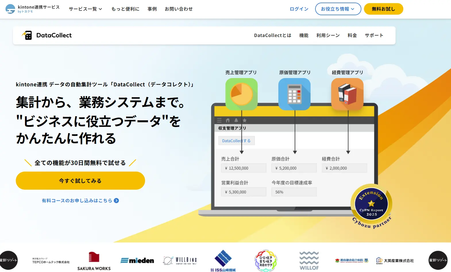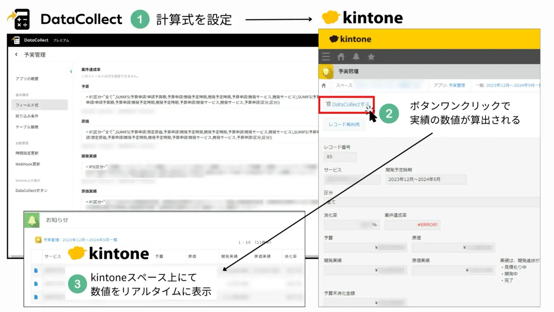 DataCollectは、kintoneアプリ間の集計や、関数を使ったさまざまな計算が実現できるkintone連携サービスです。